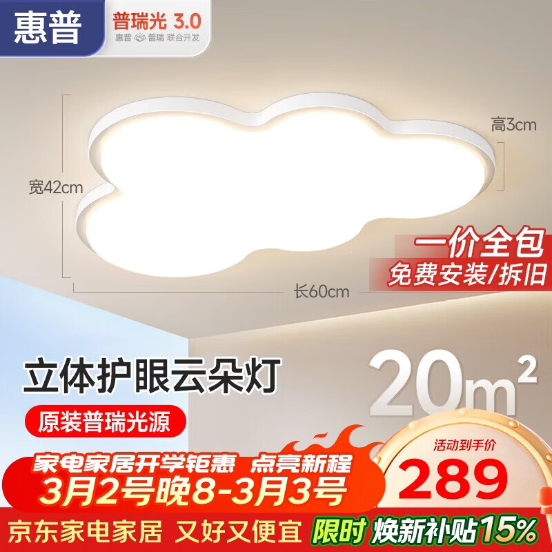 惠普普瑞护眼吸顶灯led卧室儿童房奶油风云朵灯中山灯具臻之光包安装