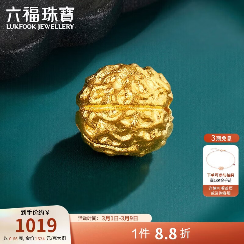 六福珠宝38节礼物 黄金转运珠小核桃福满传家足金串珠 计价 约0.66克