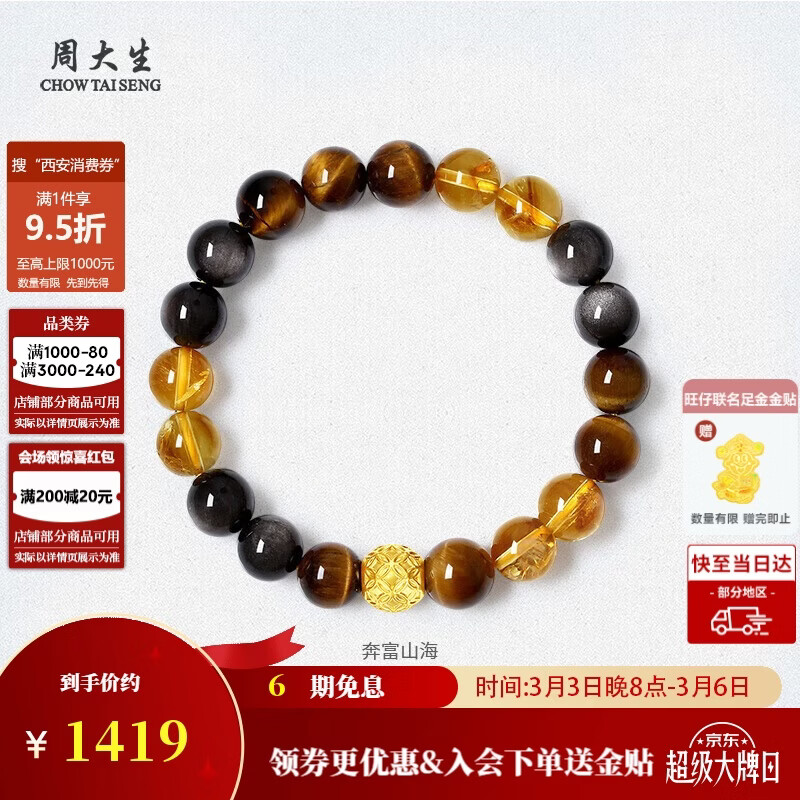 周大生【38妇女节礼物】黄金镶玉虎眼石黄水晶手串转运珠手链送男生