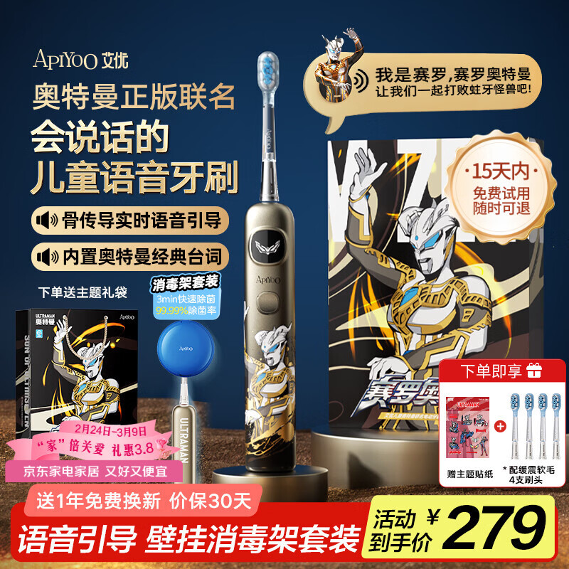 ApiYoo艾优A9pro奥特曼儿童电动牙刷蓝色消毒架套装语音提醒3-6-15岁护龈 送男女孩学生儿童节日开学礼物