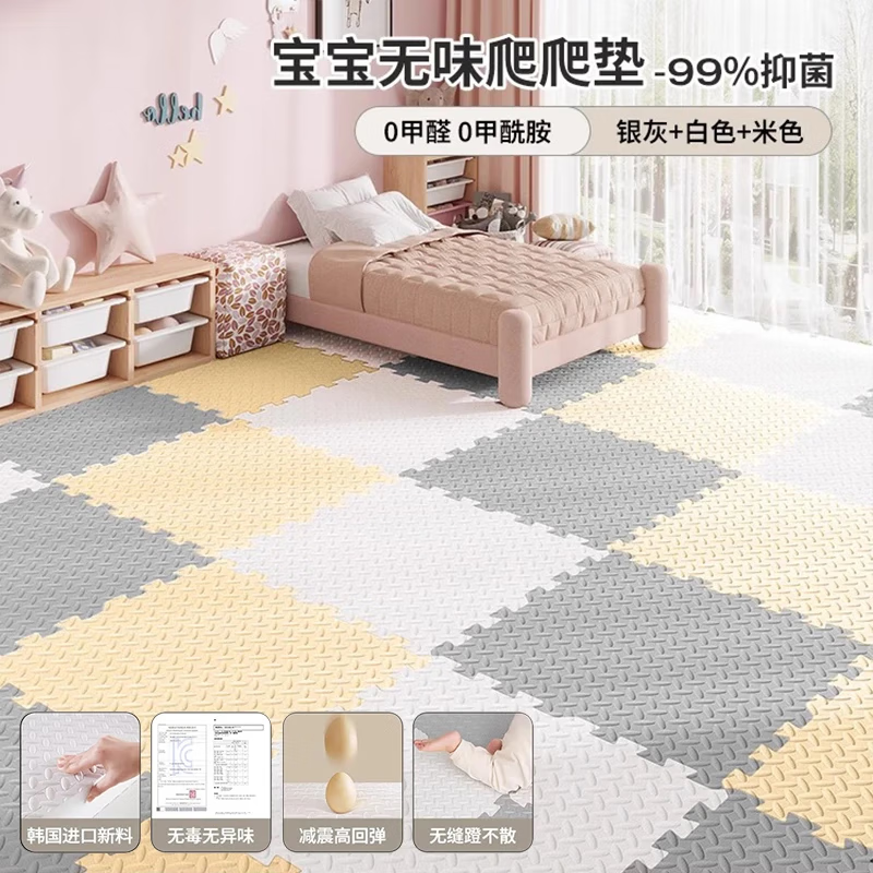 朗格拼接泡沫地垫婴儿童加厚家用爬爬垫宝宝爬行垫榻榻米海绵地铺垫子 银灰+白色+米色-送边条 0甲醛 30X30X1.2cm加厚【24片/无甲醛】