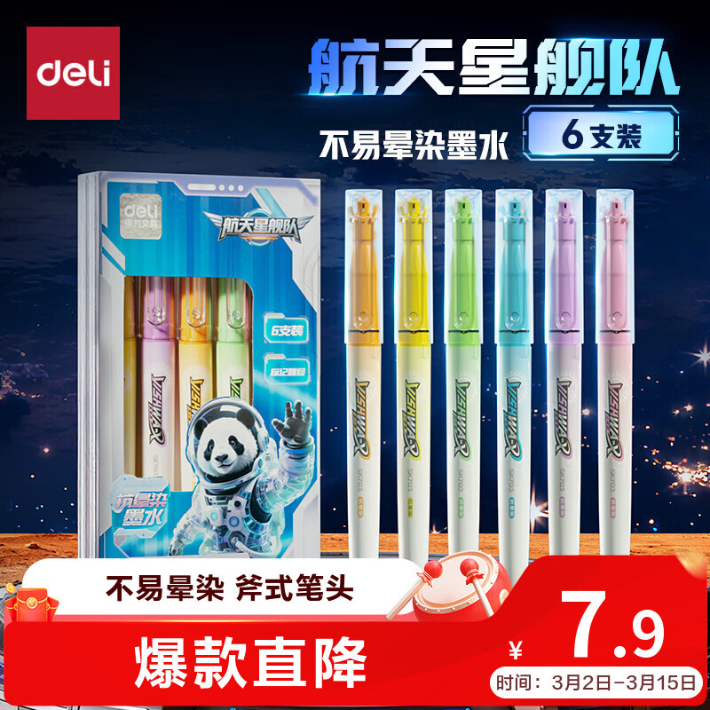 得力不易晕染荧光笔 航天星舰队6色荧光笔 考试复习划重点彩色醒目标记笔手帐笔 6支/盒SK703