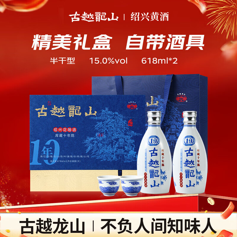 古越龙山青花醉 库藏十年 半干型 绍兴黄酒 618ml*2瓶 礼盒装 年货礼盒