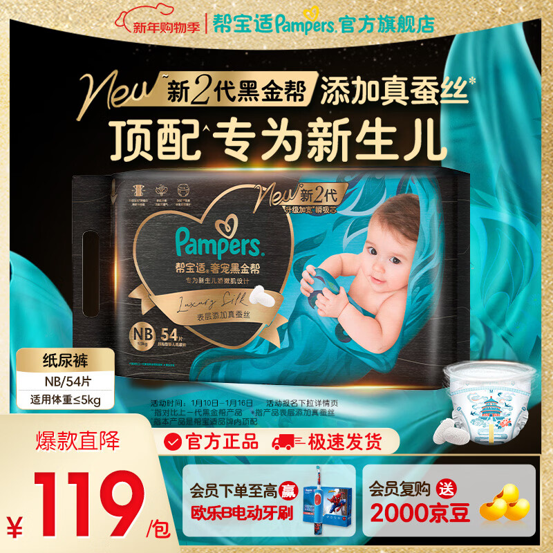 帮宝适【新生儿顶配】黑金帮纸尿裤添加真蚕丝 婴儿超薄透气尿不湿 新生儿纸尿裤NB54片(0-5kg) 常规款