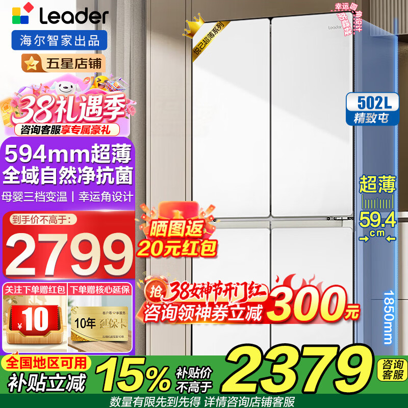 海尔冰箱出品502升四开门Leader十字开门594mm超薄机身526一级能效双变频风冷无霜大容量家用电冰箱 一级双变频 全域双净味+母婴三档变温