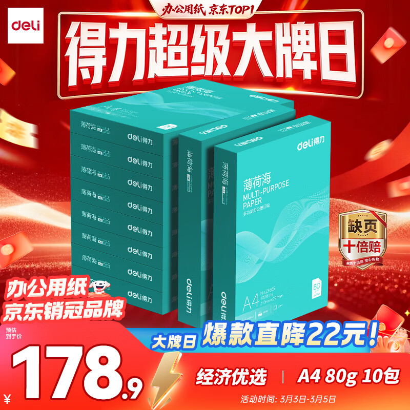 得力(deli)薄荷海A4打印纸 80g500张*10包一箱 加厚双面复印纸 高性价比草稿纸 整箱5000张ZF669【集采推荐】