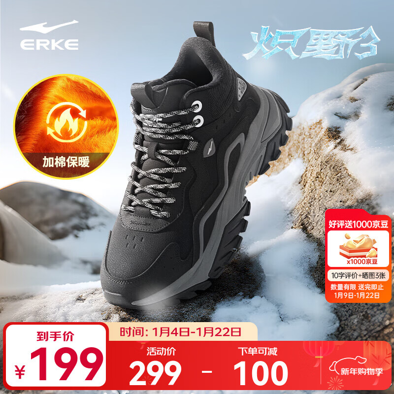 鸿星尔克炽野3加棉休闲鞋男鞋冬季新款棉鞋户外防滑保暖加厚雪地靴运动鞋 正黑/碳灰 42