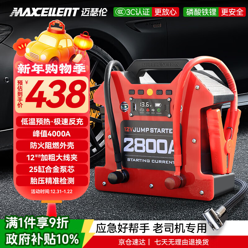 MAXCELLENT迈瑟伦【3C认证】搭电宝汽车应急启动电源充气泵紧急打火强起电瓶大容量户外充电宝 36000mAh 12V