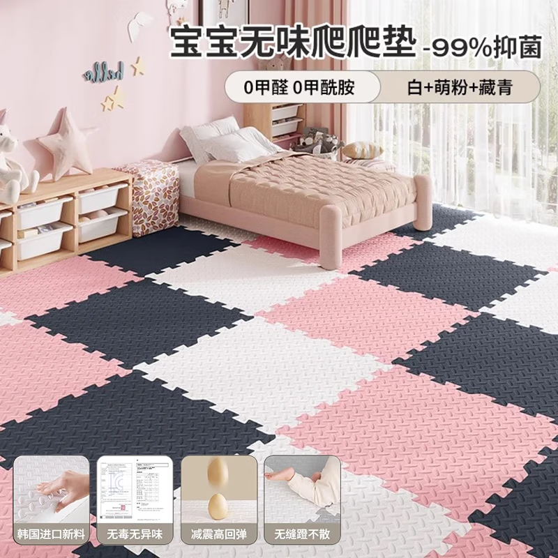 朗格拼接泡沫地垫婴儿童加厚家用爬爬垫宝宝爬行垫榻榻米海绵地铺垫子 白+萌粉+藏青-送边条 0甲醛 60X60X1.2cm加厚【36片/无甲醛】