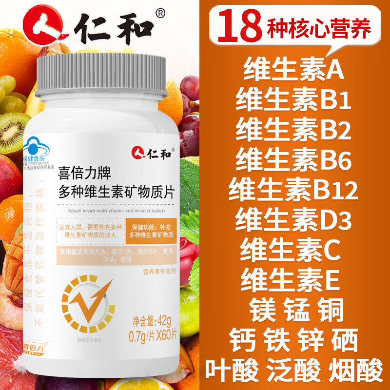 仁和多种维生素矿物质60片钙铁锌硒vaced3维生素b族男女复合多维元素