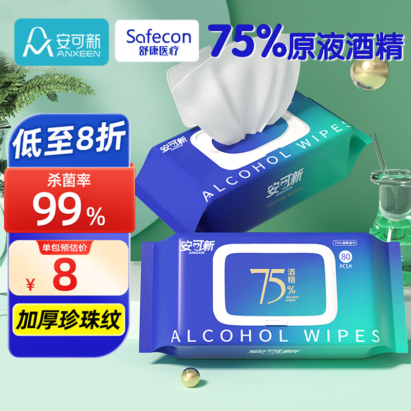 安可新 75% 酒精湿巾【80抽*2包】一次性杀菌清洁湿纸巾酒精棉片18x14cm