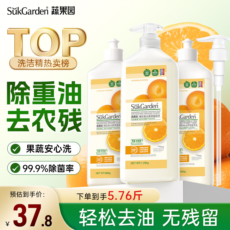 蔬果园橘彩洗洁精2.88kg 去油食品可用不伤手洗涤灵果蔬净 厨房清洁剂