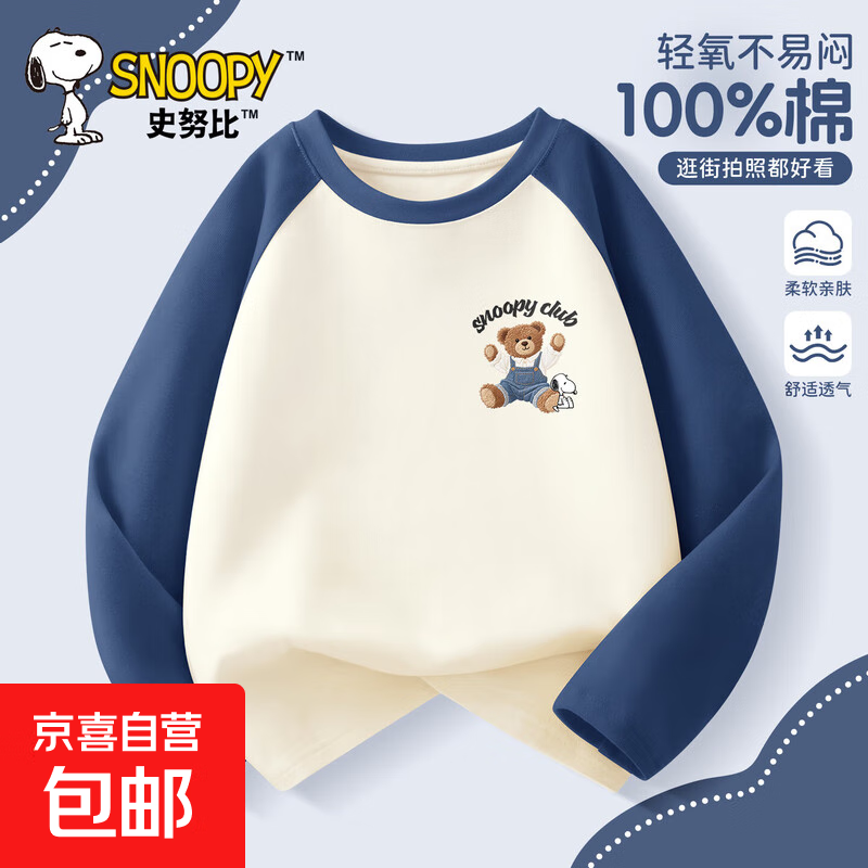 史努比(SNOOPY)男童长袖t恤春秋款2025新款纯棉童装宽松帅气上衣 刺绣熊努比K灰蓝 120