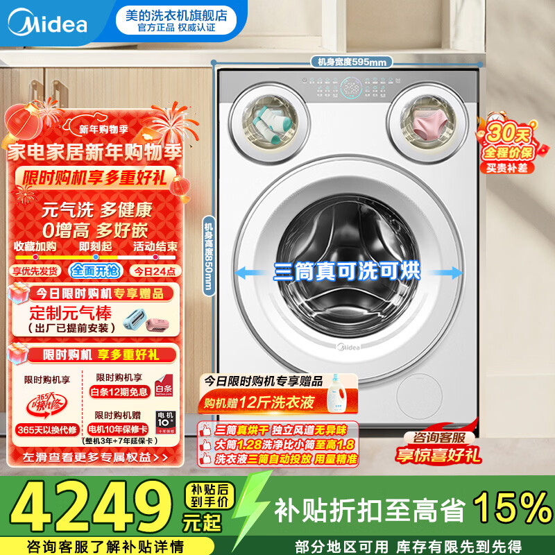 美的(Midea)三筒洗衣机洗烘一体全自动分区洗除菌净血渍三桶智能投放850mm标准高度 【可爱多MD11DDEX】 洗烘一体