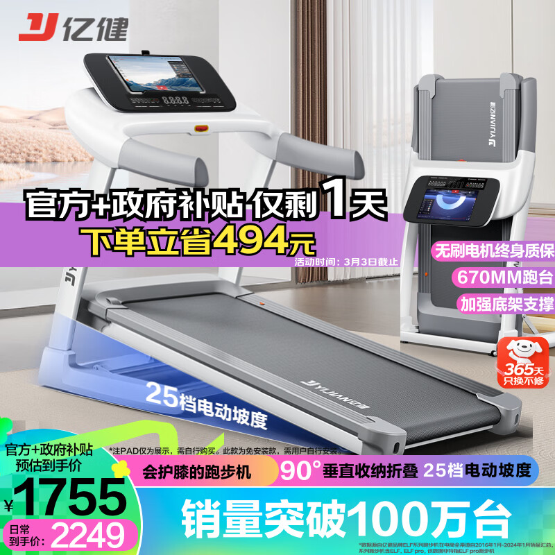 亿健(YIJIAN)家庭用跑步机ELFPro 90°全折叠25档爬坡室内走步机运动健身器材