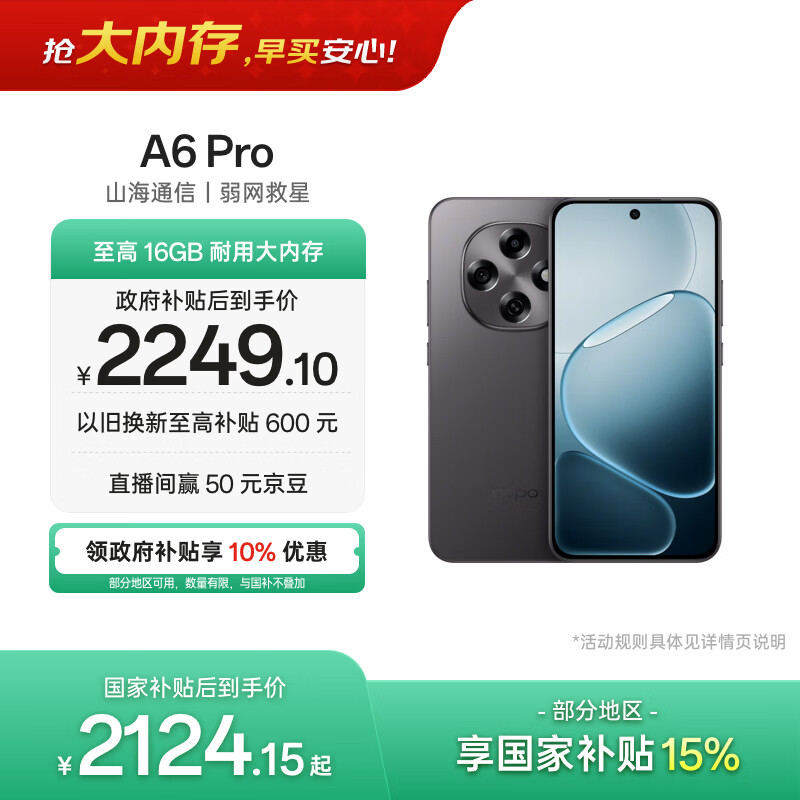 OPPO A6 Pro 16GB+512GB 墨玉黑 7000mAh大电池长续航 IP69防水 流畅抗摔耐用 5G智能手机 国家补贴