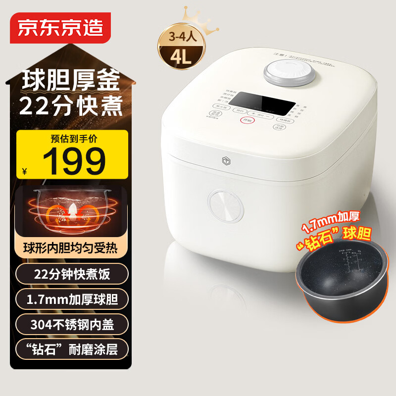 京东京造 电饭煲家用4-5人快煮多功能电饭锅 不沾内胆煮粥煲汤蛋糕 二级能效 4L JZRC40D49-A