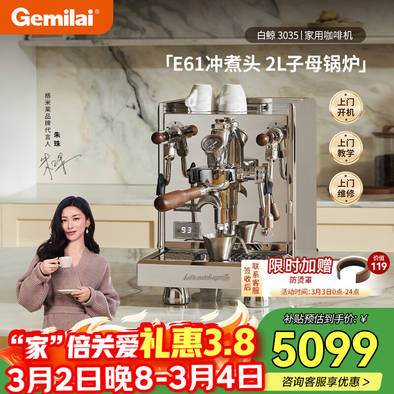 格米莱(Gemilai)【38礼物】白鲸G3035咖啡机 家用半自动咖啡机小家电美式意式浓缩 E61 2L子母锅炉