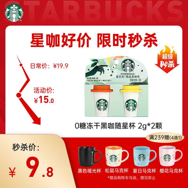 星巴克(Starbucks)精品冻干黑咖啡随星杯2.0美式+拿铁之选 0糖0脂黑咖啡尝鲜2g*2颗