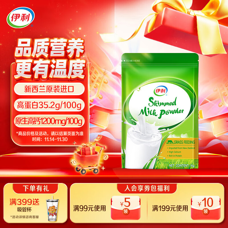 伊利新西兰进口脱脂奶粉 成人奶粉 营养品 早餐 0添加 高钙高蛋白 1kg
