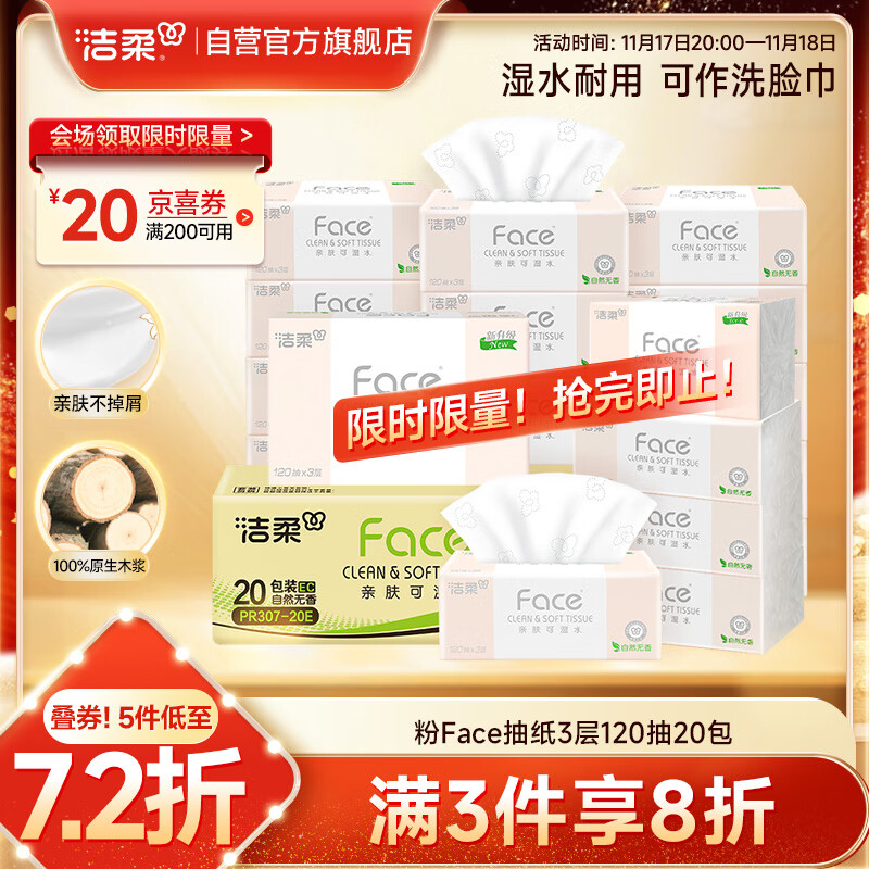 洁柔抽纸 粉Face柔韧3层120抽*20包 可湿水面巾纸 100%原生木浆 整箱