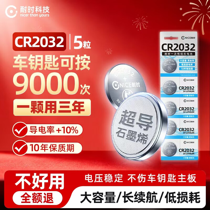 耐时(NICE)耐时石墨烯CR2032纽扣电池3V锂电池大众/奥迪/现代/等汽车钥匙/遥控器/小米盒子/耳温枪等 拍1发5|CR2032