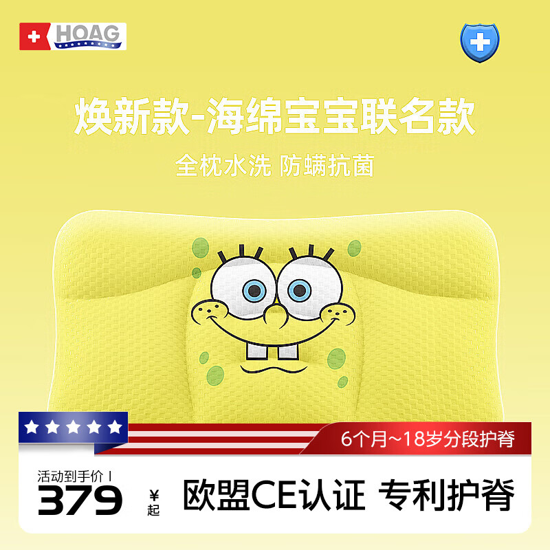 Hoag(霍格)儿童枕头1-3岁3-6岁宝宝专用四季通用婴儿枕头护颈神器 正版授权 【海绵宝宝限量款】 H1段(含可调高度填充棉包)