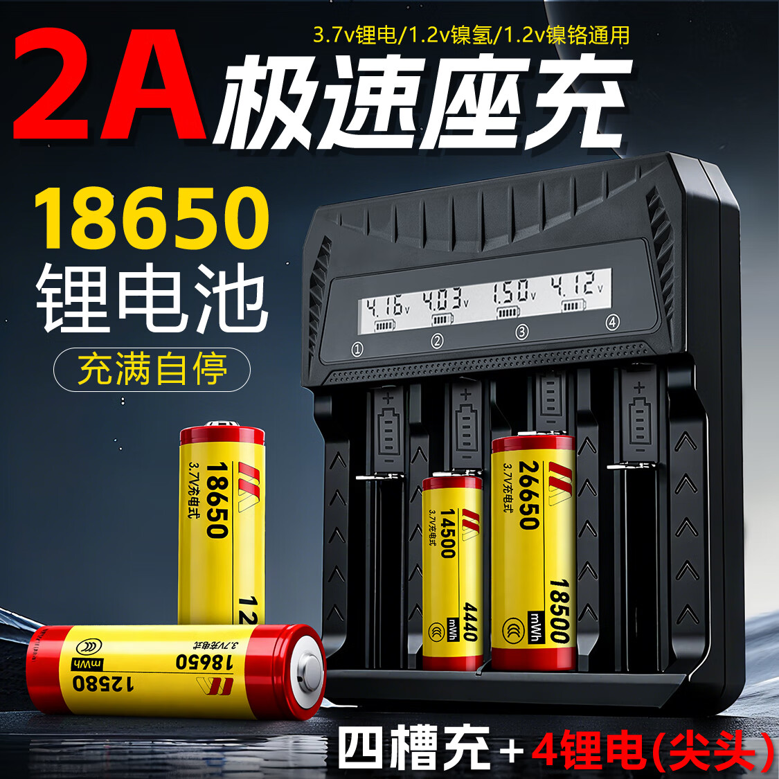 thermarest18650锂电池充电3.7V大容量快充座充原装电芯通用26650锂电充电器 四槽快充+4节18650锂电池尖头