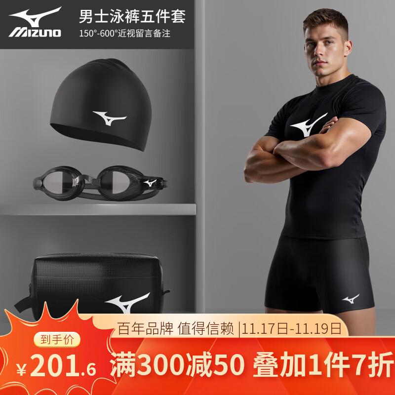 美津浓(MIZUNO)游泳裤新款男士泳裤套装泳帽泳镜三件套专业游泳装备全套男防尴尬 2105黑色 五分短袖平光五件套 M