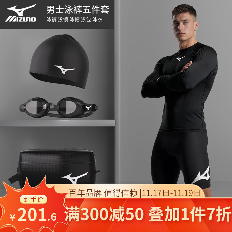 美津浓(MIZUNO)游泳裤新款男士泳裤套装泳帽泳镜三件套专业游泳装备全套男防尴尬 2105黑色 五分长袖平光五件套 M