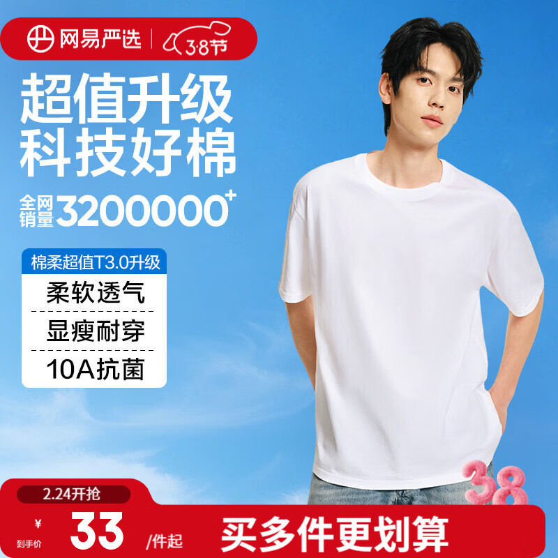 网易严选26新品10A抗菌纯棉短袖T恤新疆棉内搭圆领男女同款 短袖款-经典白 【棉柔T3.0升级】 S