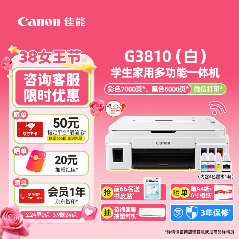 佳能(Canon)G3810大容量可加墨打印机打印复印扫描一体机家用家庭学生作业办公彩色喷墨墨仓式手机无线连接 【G3810 白】3in1-无线打印-7000页 官方标配