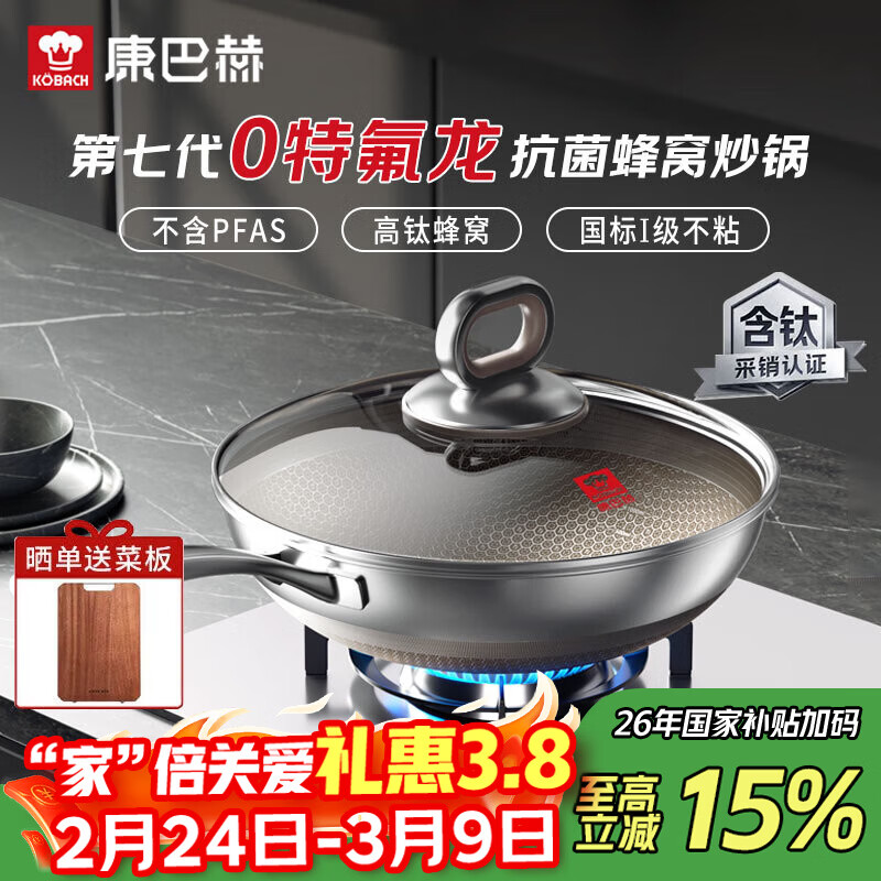 康巴赫炒锅有钛不粘锅第七代炒菜锅0氟蜂窝锅32cm电磁炉燃气灶通用