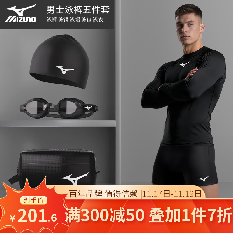 美津浓(MIZUNO)游泳裤新款男士泳裤套装泳帽泳镜三件套专业游泳装备全套男防尴尬 1128黑色 平角长袖平光五件套 L
