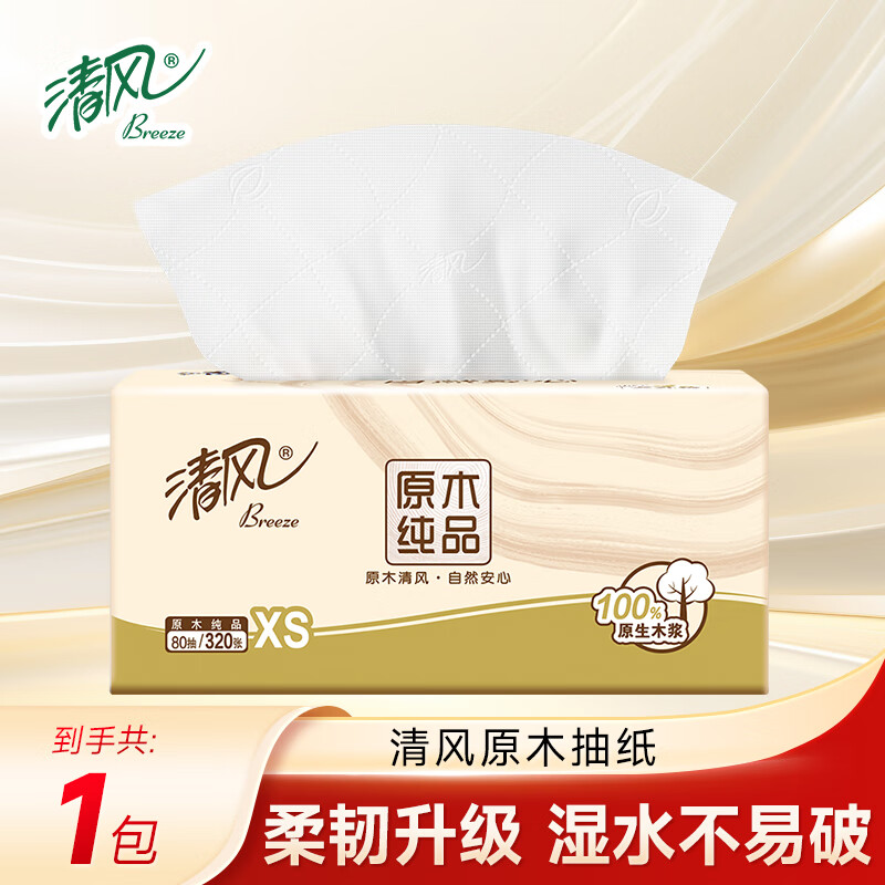 清风抽纸 原木纯品4层柔韧亲肤 面巾纸餐巾纸卫生纸纸巾家用整箱批发 4层 80抽*1包 【XS码】