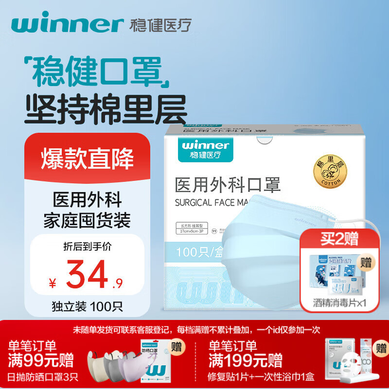 稳健一次性医用外科口罩100只独立装棉里层亲肤透气防过敏防尘防晒
