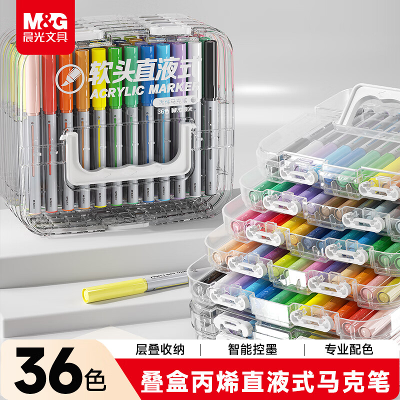 晨光(M&G)文具直液式丙烯马克笔36色软头学生儿童叠盒可水洗画笔记号笔荧光笔手绘 生日礼物 APMT80P0