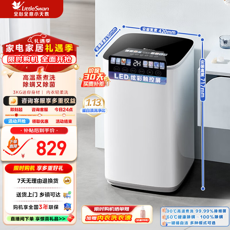 小天鹅(LittleSwan)波轮洗衣机全自动小型家用 3公斤迷你婴儿儿童内衣洗衣机 加热高温蒸煮洗 除菌除螨 TB30VH90E 波轮