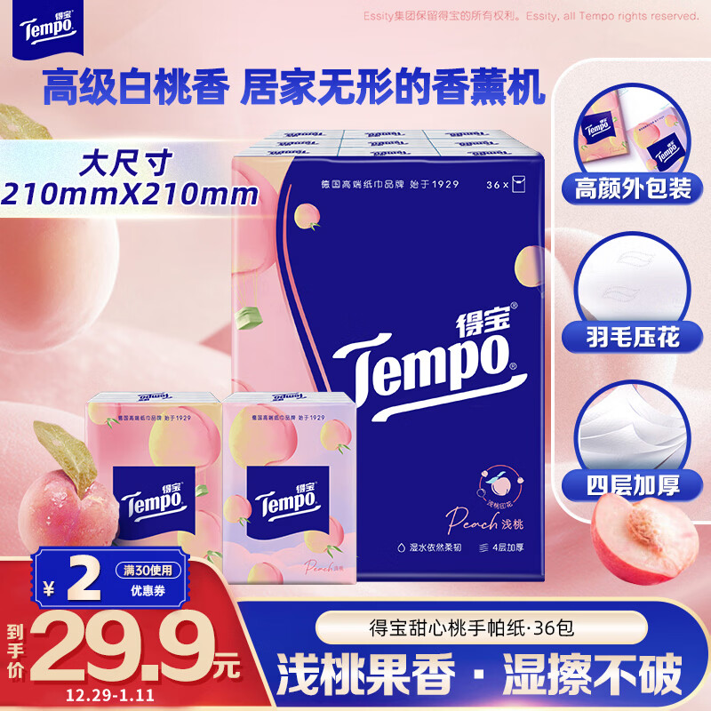 得宝(TEMPO)一博同款 手帕纸 甜心桃味4层7张*36包 湿水不破 纸巾小包 面巾纸