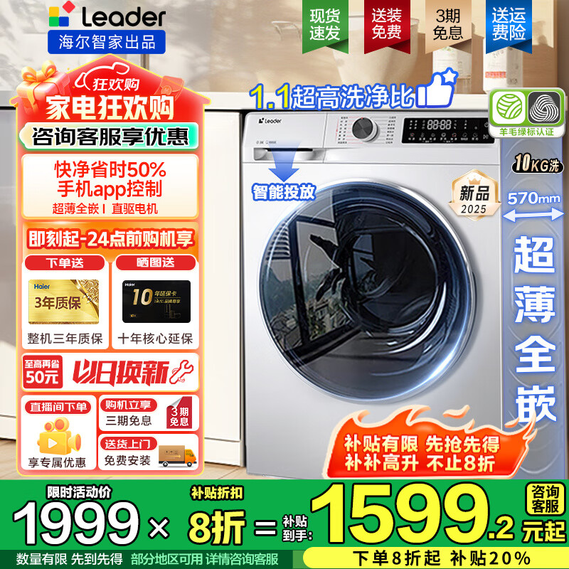 海尔(Haier)全自动滚筒洗衣机洗烘一体直驱洗衣机10公斤超薄洗衣机 智家出品Leader 以旧换新补贴20% 【单洗】直驱+智能投放+快净+夜洗+羊毛绿标