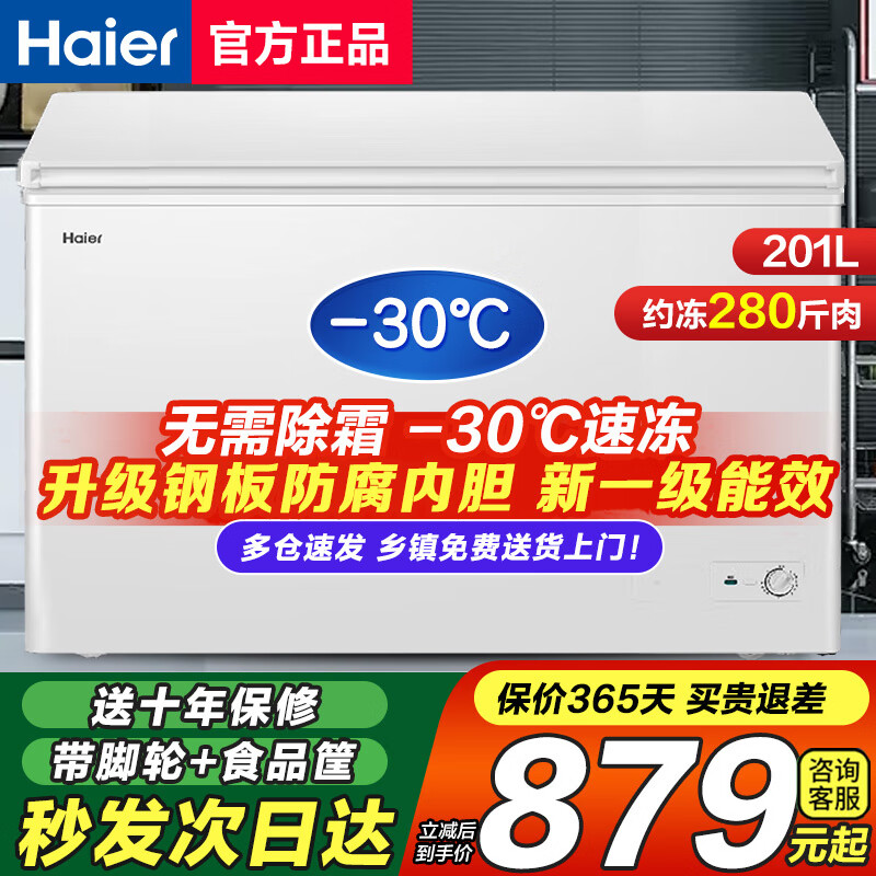海尔(Haier)冰柜家用无需除霜200/300升全冷冻超低温柜一级节能省电冷藏冷冻两用卧式冷柜补贴极速达 201升 加大升级款【-30℃无需除霜+钢板内胆】