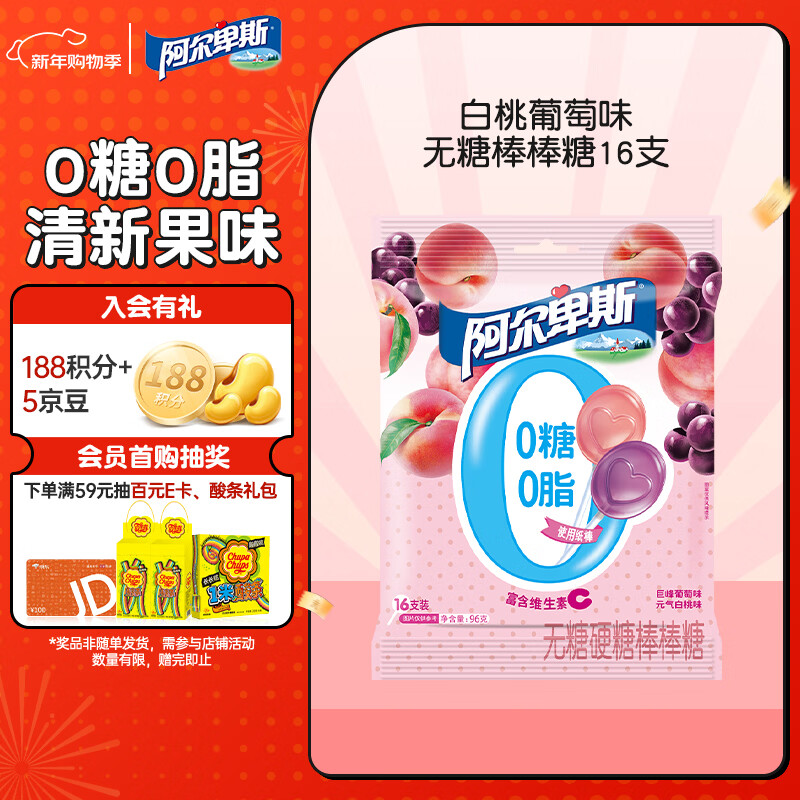 阿尔卑斯 白桃葡萄味无糖棒棒糖96g 16支 休闲零食儿童水果糖果开学礼物