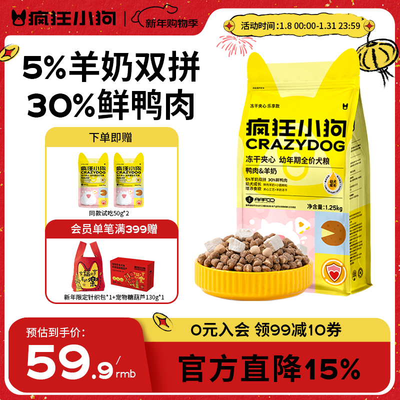 疯狂小狗狗粮幼犬冻干夹心奶糕粮鸭肉羊奶1.25kg比熊中小型犬离乳期2.5斤