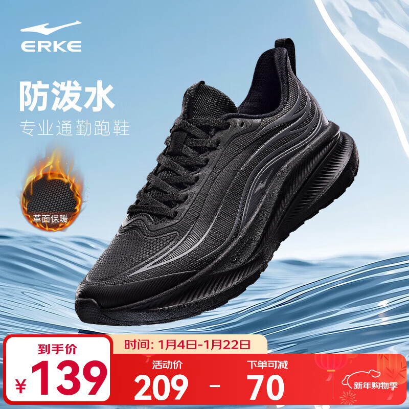 鸿星尔克男鞋秋冬季新款防泼水革面跑鞋黑色轻便跑步鞋保暖运动鞋子男款 正黑 42