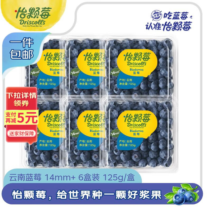 怡颗莓Driscoll's 云南蓝莓14mm+ 6盒装 约125g/盒 新鲜水果 源头直发