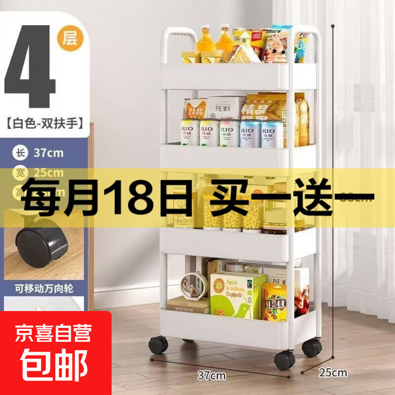 浴室小推车置物架厨房客厅卫生间多层卧室床头收纳零食落地储物架 极简白-长方形四层(带轮)