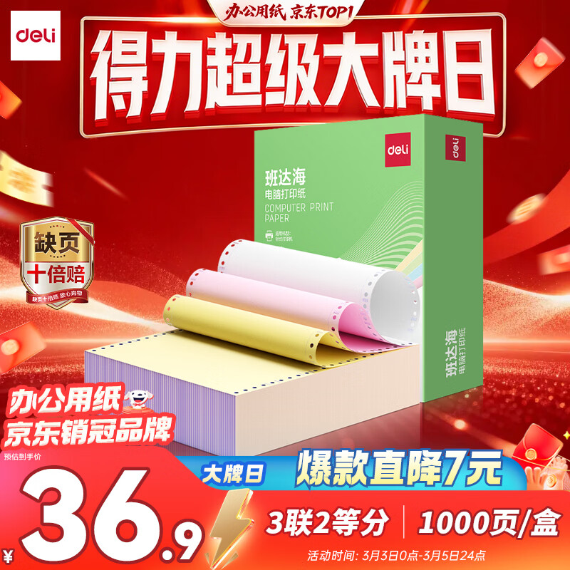 得力(deli)【缺页十倍赔】班达海三联二等分针式打印纸 可撕边电脑打印纸 彩色(白红黄)发票报销单1000页/箱