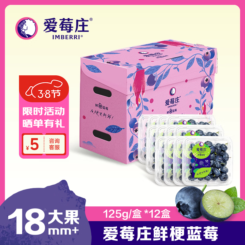 爱莓庄云南鲜梗蓝莓 脆甜新鲜手采现摘 18mm+12 盒装 约125g/盒源头直发