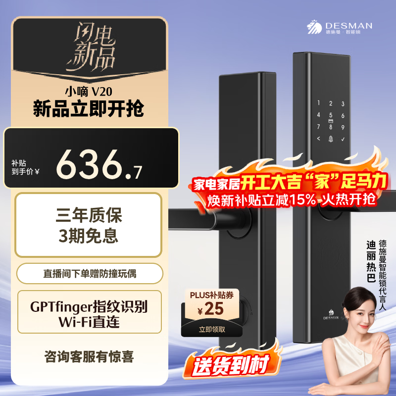 德施曼(DESMAN)智能门锁电子锁家用防盗门锁一握即开指纹密码锁小嘀V20 典雅黑