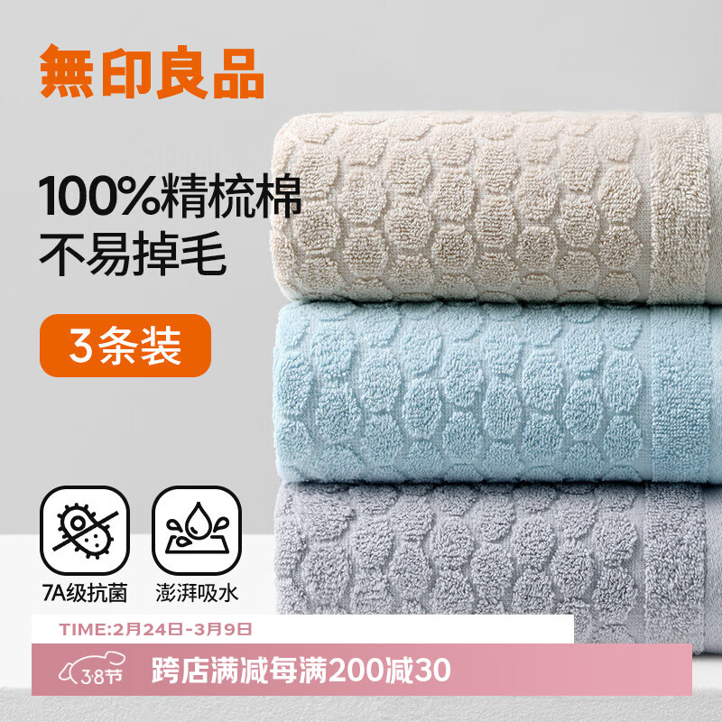 无印良品毛巾3条新疆全棉7A级抗菌男士100%纯棉毛巾家用超吸水洗澡擦脸巾